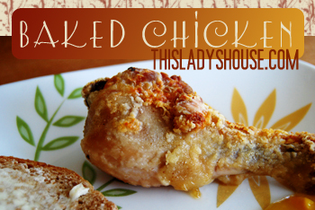 Heat oven to 375. Cut butter in pieces and put in a baking pan lined with foil. Place in oven to melt butter while preparing chicken. Mix all dry ingredients in a bag. Add chicken pieces and shake until covered. Place in baking pan and bake for 30 minutes. Turn and bake on other side for 30 minutes longer.