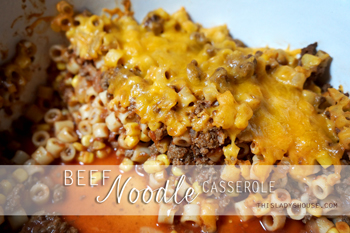Cook noodles according to package directions, drain well. Brown ground beef and onion. Combine all ingredients except cheese and place in a 2qt casserole dish. Bake at 350 for 25 minutes or until bubbly, sprinkle with cheese during the last 5 minutes of cooking.