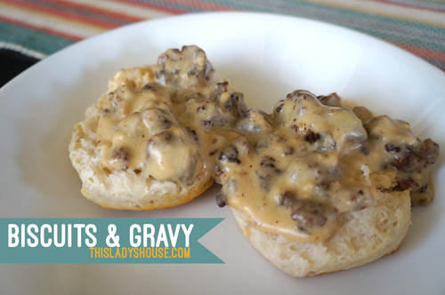 Gradually add milk; cook until mixture comes to a boil and thickens, stirring constantly. Reduce heat to medium-low; simmer 2 minutes, stirring constantly. Season to taste with salt and pepper. Split biscuits in half. Place halves on each plates; top with about 1/3 cup gravy.