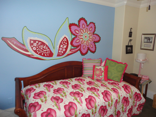 The blue wall with the giant flower gives such a striking first impression! We simply picked a flower out of the fabric from the pillows on the bed, enlarged it with an overhead projector and painted it right on the wall. The result was a perfectly coordinating mural.