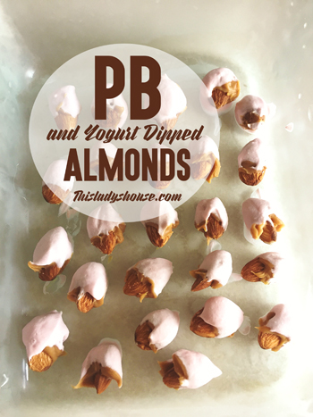 Open your yogurt and have peanut butter on a spoon. Individually cover each almond lightly in the peanut butter then dip into the yogurt and set onto freezer safe dish. Continue process until all are done and freeze for about 3-4 hours and serve immediatly! Store in the freezer.