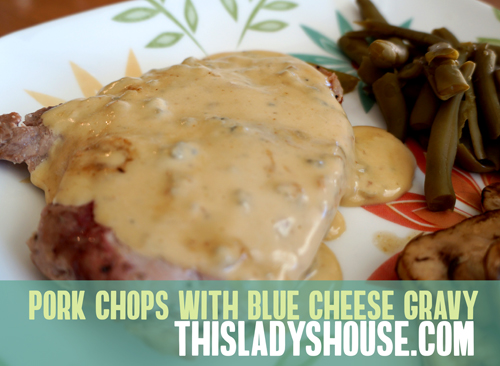 Melt butter in a large skillet. Season pork chops with black pepper and garlic powder, cook in butter (turning occassionally) until no longer pink. Remove pork chops to a plate and cover to keep warm. Add whipping cream to skillet, loosen any bits of meat stuck to the bottom. Add blue cheese and cook until thickened. Serve over warm pork chops.