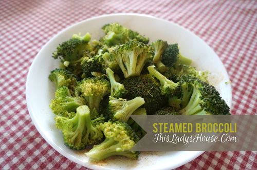 While broccoli is steaming place garlic, olive oil and lemon juice in a medium size bowl. When broccoli is done toss with garlic mixture until coated. Serve hot.